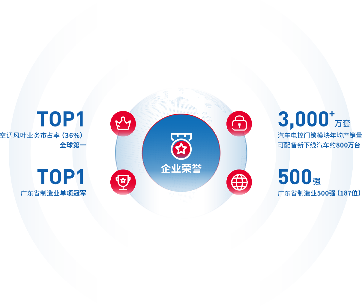 順威股份成立于1992年,2012年在深交所主板上市,是全球空調低壓送風(fēng)領(lǐng)域龍頭企業(yè)、汽車(chē)電子門(mén)鎖領(lǐng)域領(lǐng)先企業(yè),空調風(fēng)葉業(yè)務(wù)市占率全球第一(超35%),汽車(chē)電控門(mén)鎖模塊全球市場(chǎng)占有率領(lǐng)先(年均產(chǎn)銷(xiāo)量超3,000萬(wàn)套),先后獲得廣東省制造業(yè)單項冠軍、省級智能制造示范企業(yè)、省制造業(yè)500強、省企業(yè)技術(shù)中心等榮譽(yù)。